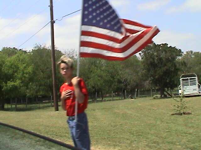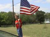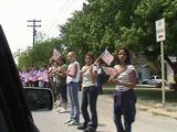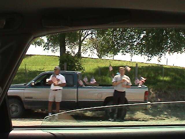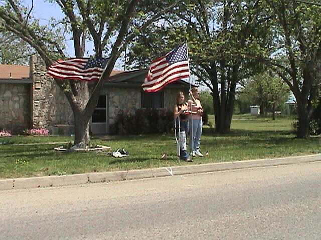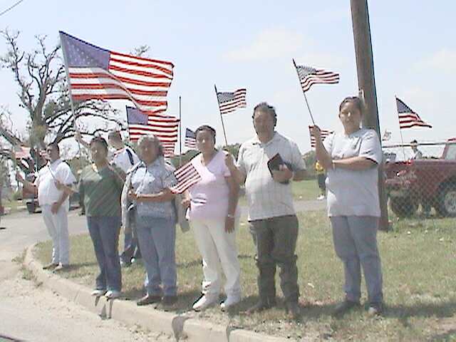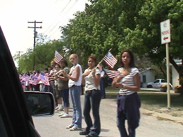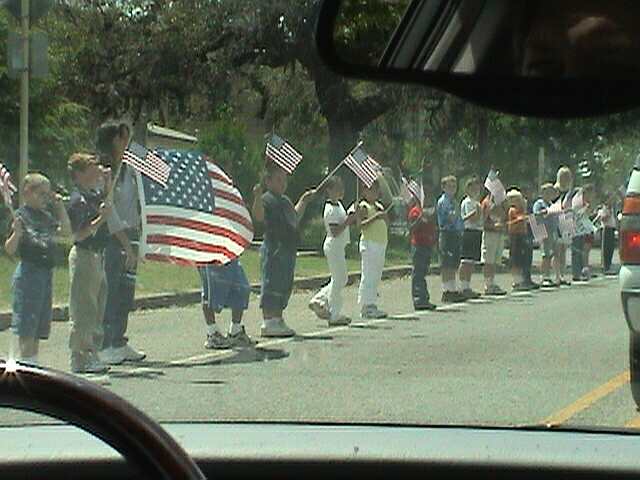 When we turned off the highway suddenly there were teenage boys along both sides of the street about every 20 feet or so, all holding large American flags on long flag poles, and again with their hands on their hearts. We thought at first it was the Boy Scouts or 4F club or something, but it continued .... for two and a half miles. Hundreds of young people, standing silently on the side of the road with flags. At one point we passed an elementary school, and all the children were outside, shoulder to shoulder holding flags ... kindergartners, handicapped, teachers, staff, everyone. Some held signs of love and support. Then came teenage girls and